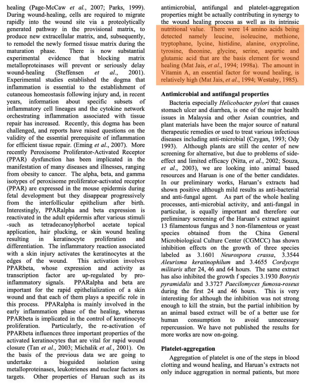Terdapat 14 jenis asid amino utama dalam haruan (termasuk glycine, leucine, isoleucine) penting untuk pembentukan tisu baru, sintesis kolagen & healing. Haruan juga kaya vitamin A — penting untuk kesihatan kulit & penyembuhan luka.